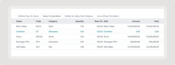 tab Salary Computation secara otomatis terisi setelah tombol Compute Sheet diklik. Dengan melakukan hal tersebut, akan menampilkan gaji, potongan, pajak, dll. untuk entri tersebut.