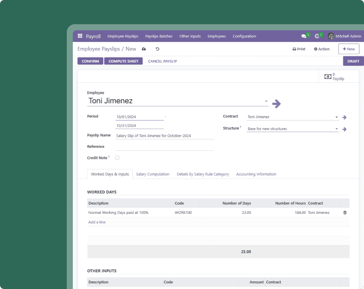 Setelah memilih karyawan, sebagian besar bidang terisi otomatis. Gunakan tombol compute sheet untuk memudahkan pengisian detail payslip Anda!