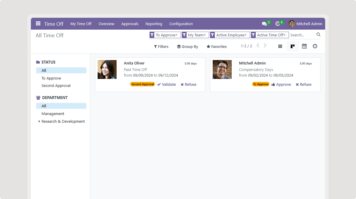 Tidak lagi membuang waktu dengan proses yang terlalu kompleks atau proses approval manual. Dengan semua permintaan tim Anda dalam satu dashboard, Anda memiliki semua informasi yang Anda butuhkan untuk menyetujui cuti secara instan.
